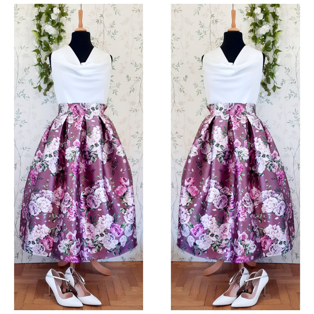 Gonna a pieghe Sabrina in stile anni '50, fantasia di rose (var. rosa antico)